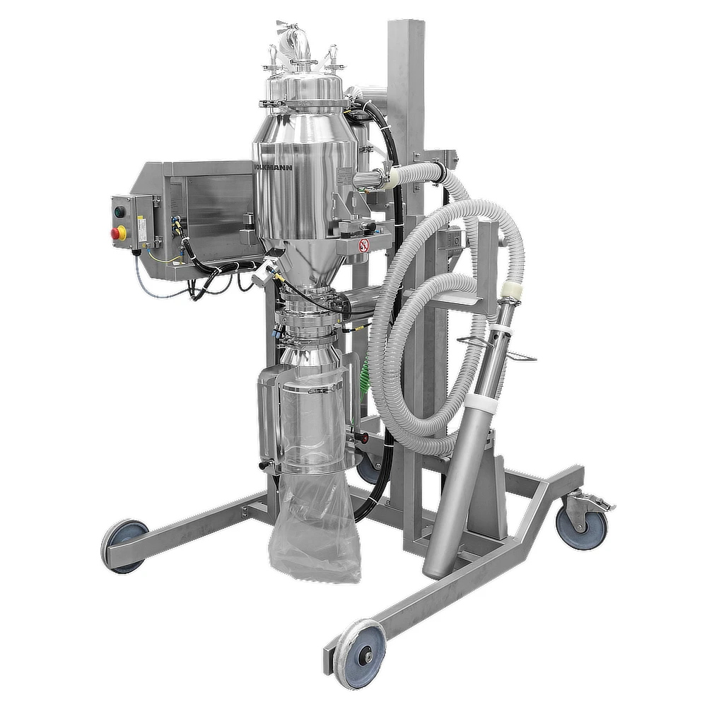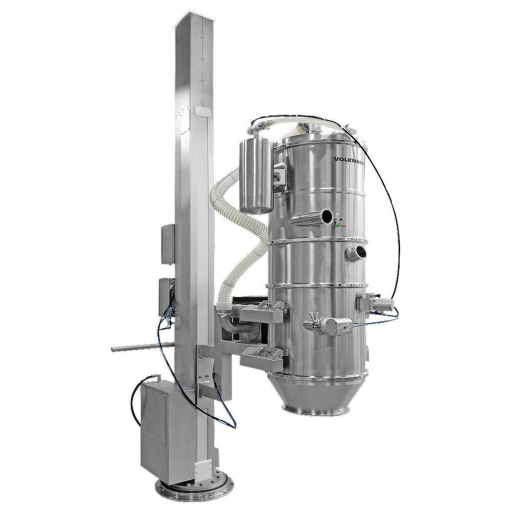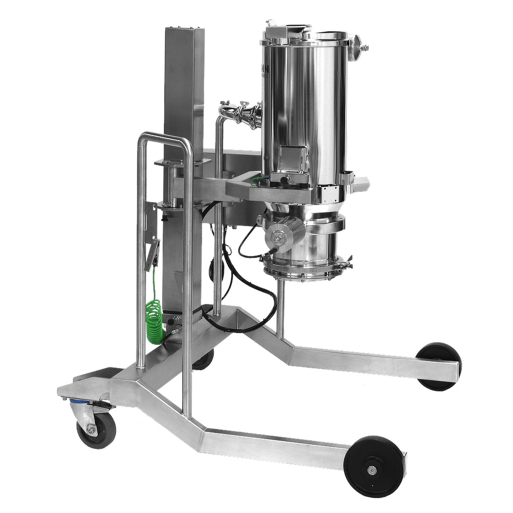 The vacuum conveyor can be brought into position, connected dust-free, powder tight, and free of forces induced to the system below the conveyor, which might be critical to the process stability for example with tablet presses or filling machines. Mounted on a mobile hoist, one vacuum conveyor can be used to feed material into various machines, one after the other. With a hoist, removing the conveyor from the machine for cleaning and maintenance is easy, no tools are required for (dis-) assembly.