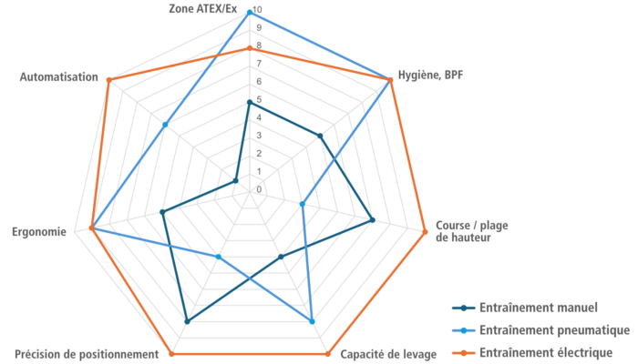 - Un entraînement électrique offre une grande précision de positionnement lors de l'approche d'une position verticale quelconque et convient donc, par exemple, aux hauteurs de remplissage variant fréquemment. Il permet en outre des hauteurs de levage élevées, même avec des charges importantes.