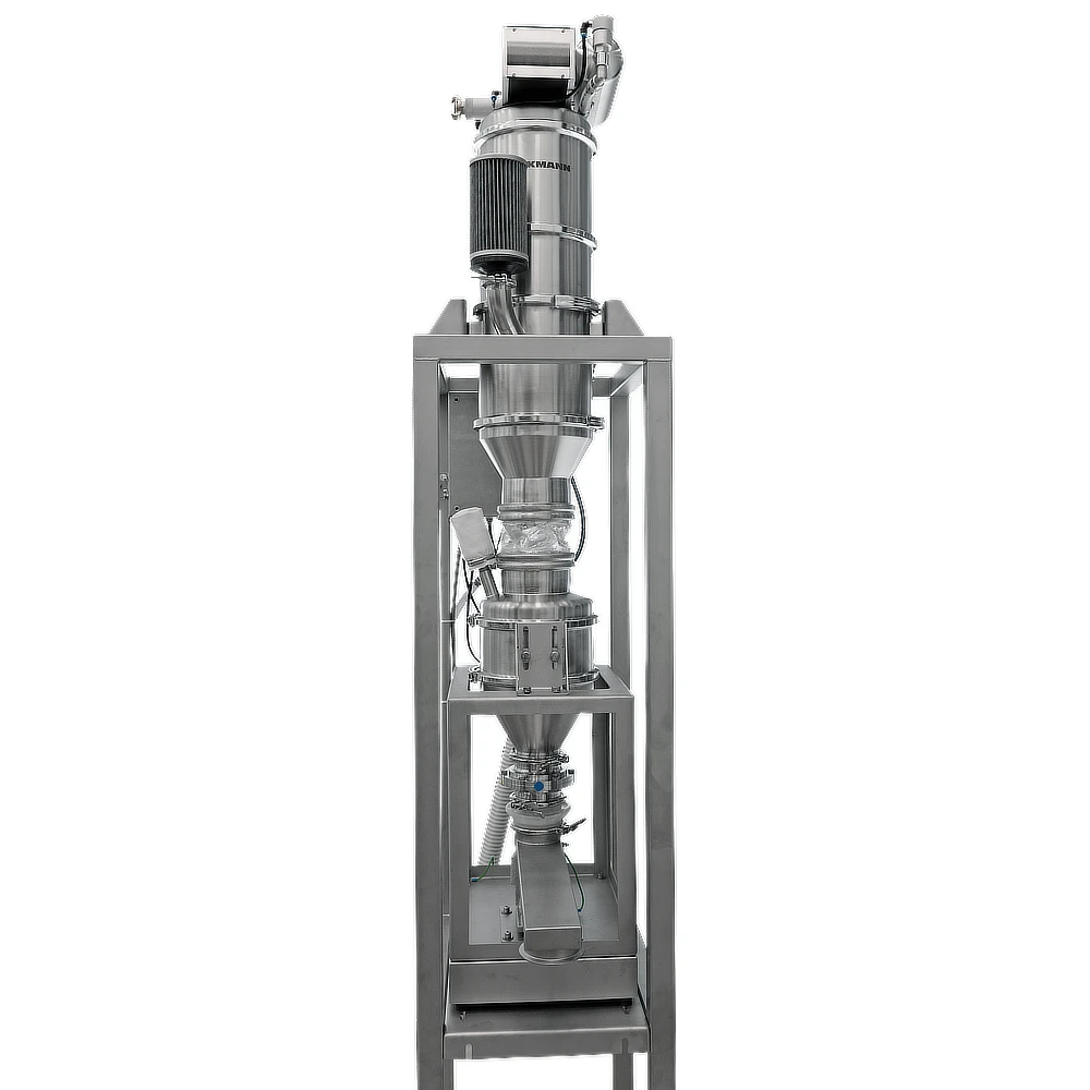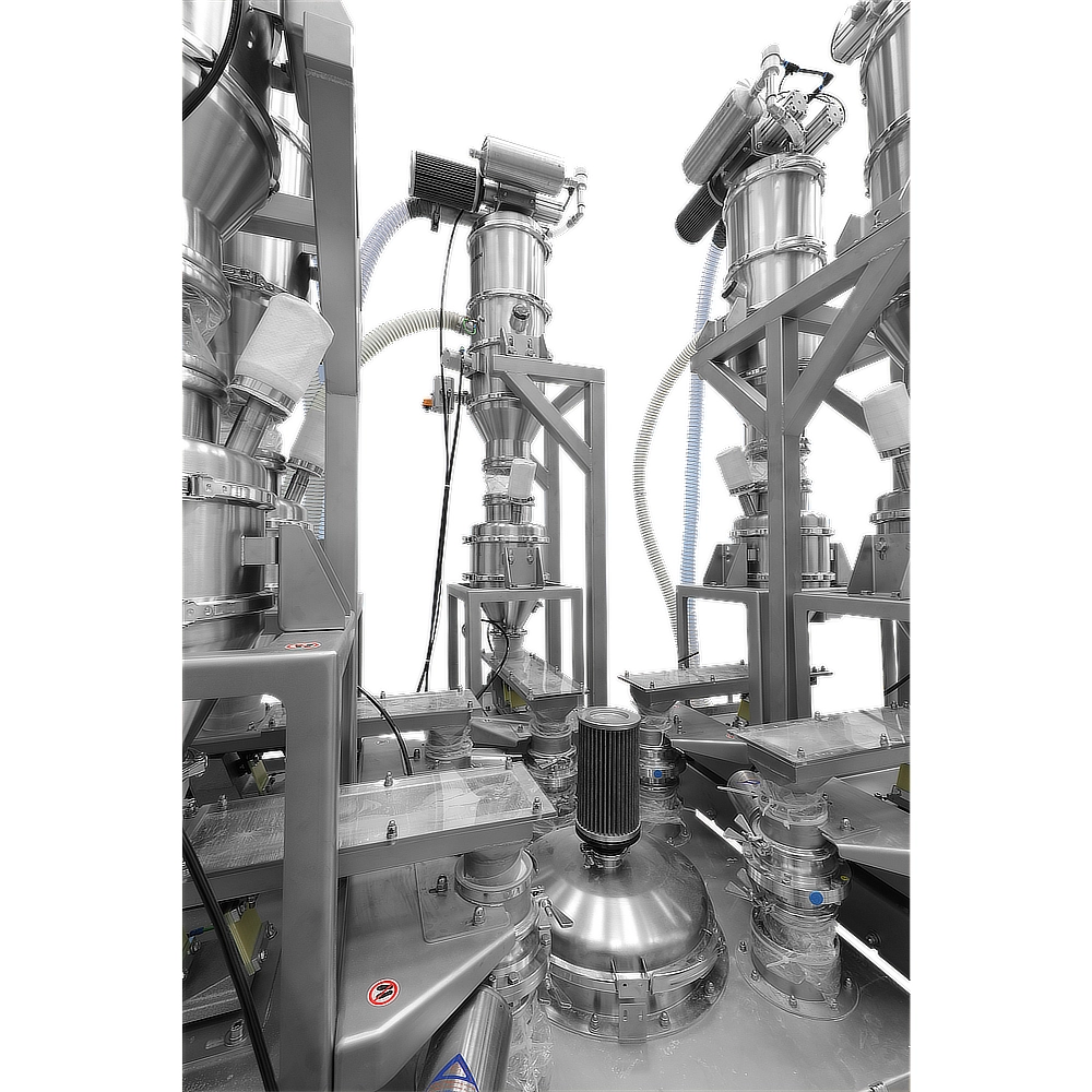 Selon l’application, la goulotte vibrante ouverte ou le tube de dosage hygiénique fermé sont recommandés ; les deux systèmes sont faciles à nettoyer. En combinaison avec un convoyeur à vide et un tampon de matériau, il est possible de mettre en œuvre différents types de pesage. Un exemple est le pesage négatif ou le dosage à l’aide d’une goulotte vibrante. En fonction du type de matériau, il est possible d’obtenir une précision allant jusqu’à 1g par cycle. Il est également possible de transformer un processus d’alimentation discontinu en un processus d’alimentation continu. Et ce, à une capacité allant jusqu’à 1000 kg/h.