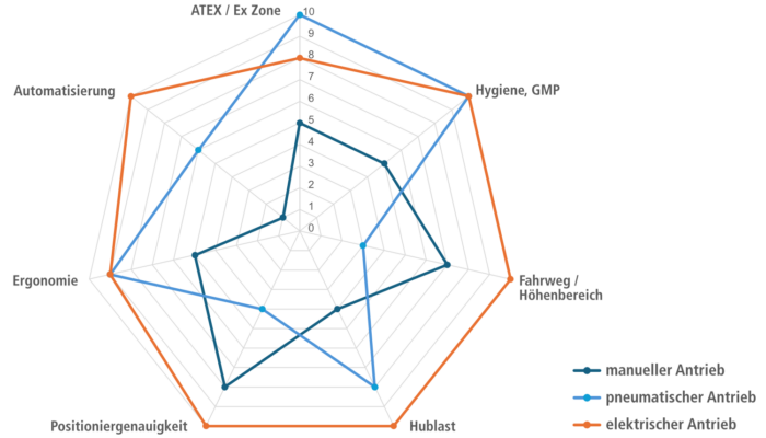 - Ein elektrischer Antrieb bietet eine hohe Positioniergenauigkeit beim Anfahren einer beliebigen vertikalen Position und eignet sich daher beispielsweise bei häufig variierenden Einfüllhöhen. Er ermöglicht zudem hohe Hubhöhen, auch bei großen Gewichten.